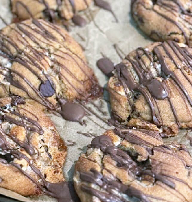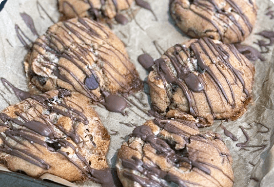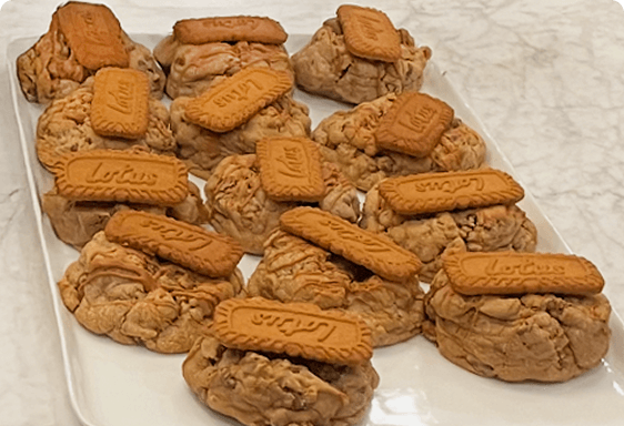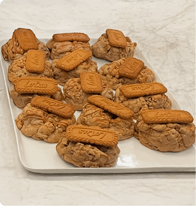 Cookie butter dough, biscoff cookie pieces, and cookie butter drizzle